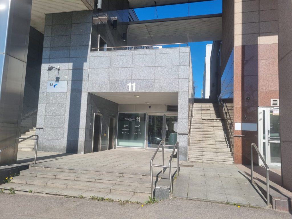 👉 Pääsisäänkäynti löytyy Ratapihantien puolelta, samalla puolella rakennusta, jota vasten kulkee junarata.